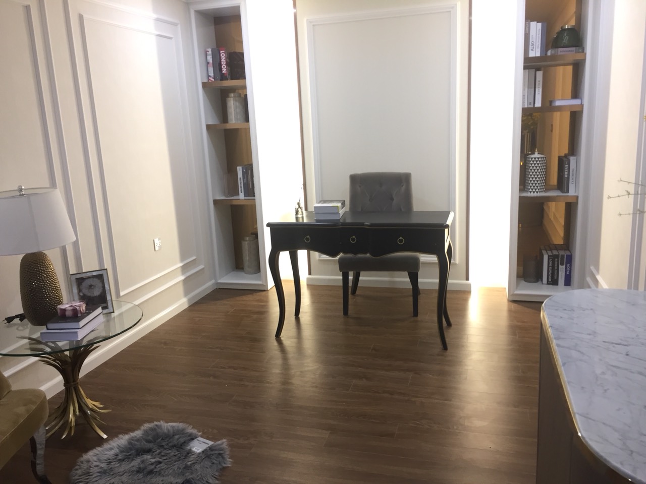 Đèn, trần thạch cao, sàn gỗ.