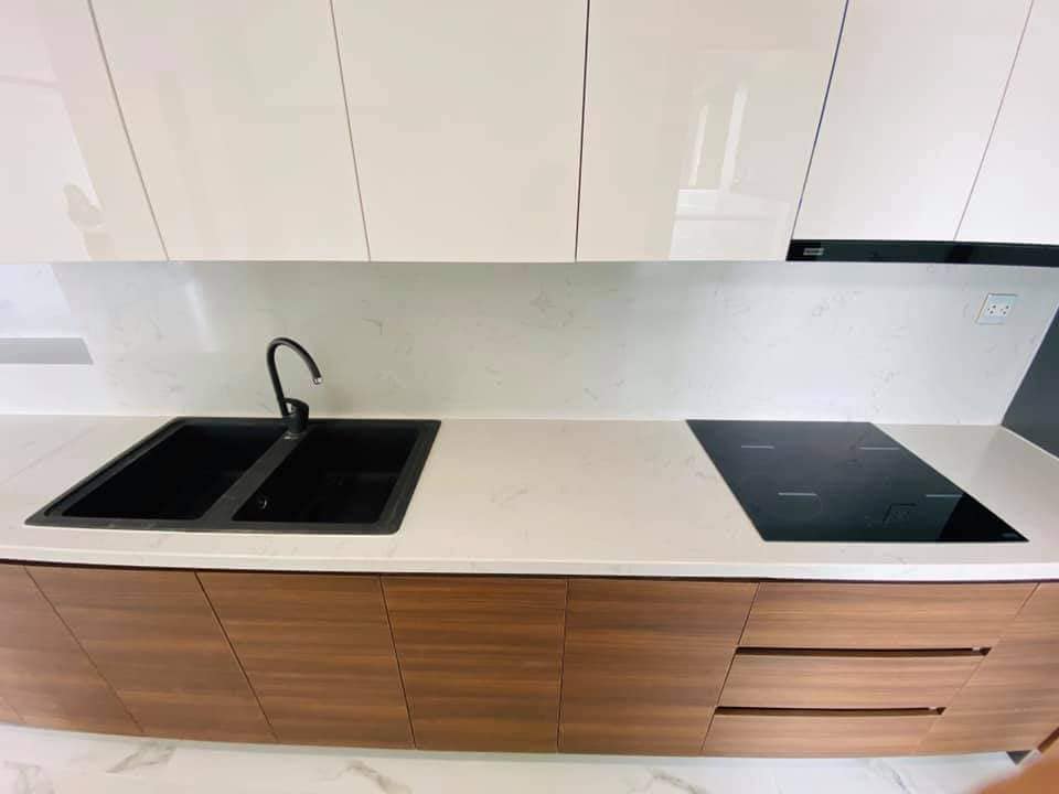 Bàn giao nội thất liền tường; Nhà tắm với chi tiết mạ vàng bồn tắm, tay gạt, vòi sen, cùa Kohler, bàn bếp, tủ bếp, bếp từ,chậu rửa, của Hafele, trần thạch cao, sàn đá , gỗ, cửa portar door chống cháy, chống ồn, cửa LOW-E chạm sàn 3 lớp chống bụi, ồn, tia bức xạ mặt trời,diều hòa âm trần Multi Daikin.