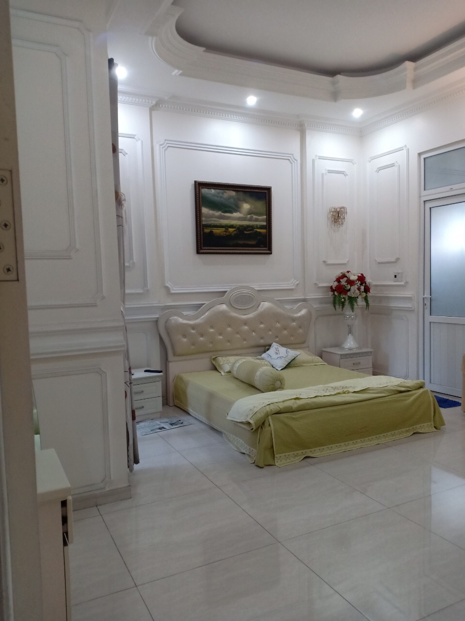 Kết cấu nhà 1 trệt, 1 lửng, 2 lầu gồm 2PK, 5PN, phòng ăn, nhà bếp, 1 gara, phòng thờ và 5WC. Vật liệu trang trí trong nhà toàn cao cấp.