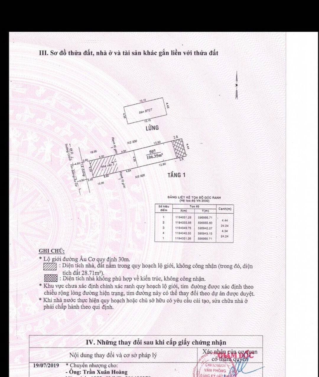 Diện tích: 105m. Ngang 4,34 nở hậu 4,44m. Dài 24,5m