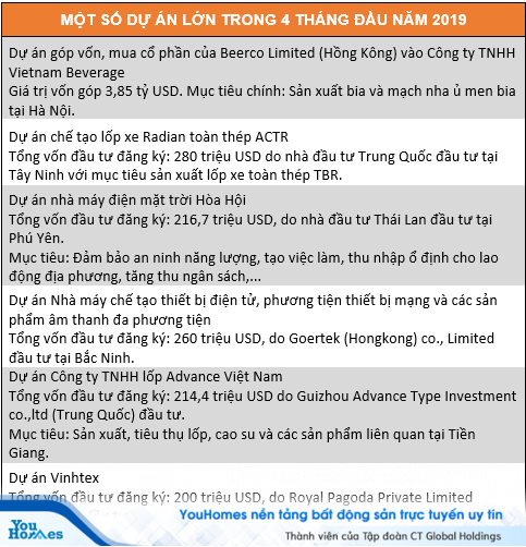 Tính đến 20/4/2019, tổng vốn đăng ký cấp mới, tăng thêm và góp vốn mua cổ phần của nhà đầu tư nước ngoài là 14,59 tỷ USD, tăng 81% so với cùng kỳ năm 2018. Đây là con số kỷ lục về giá trị vốn đầu tư đăng ký của 4 tháng trong vòng 4 năm trở lại đây (năm 2016 đạt 7,5 tỷ USD, năm 2017 đạt 10,6 tỷ USD và năm 2018 đạt 8 tỷ USD).
