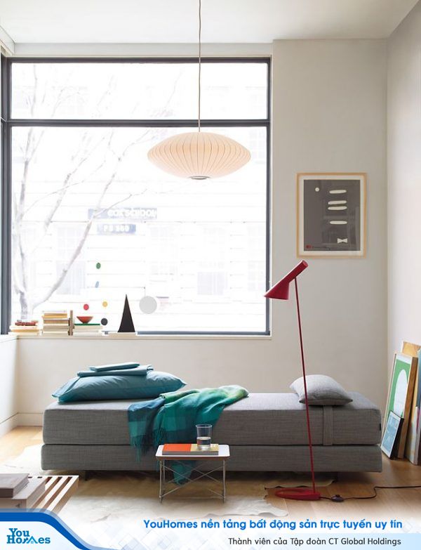 Chiếc giường đa năng với phong cách hiện đại rất phù hợp cho những chàng trai độc thân. Với những ô cửa sổ rộng tràn đầy nắng, giúp tận dụng tối đa nguồn sáng tự nhiên.