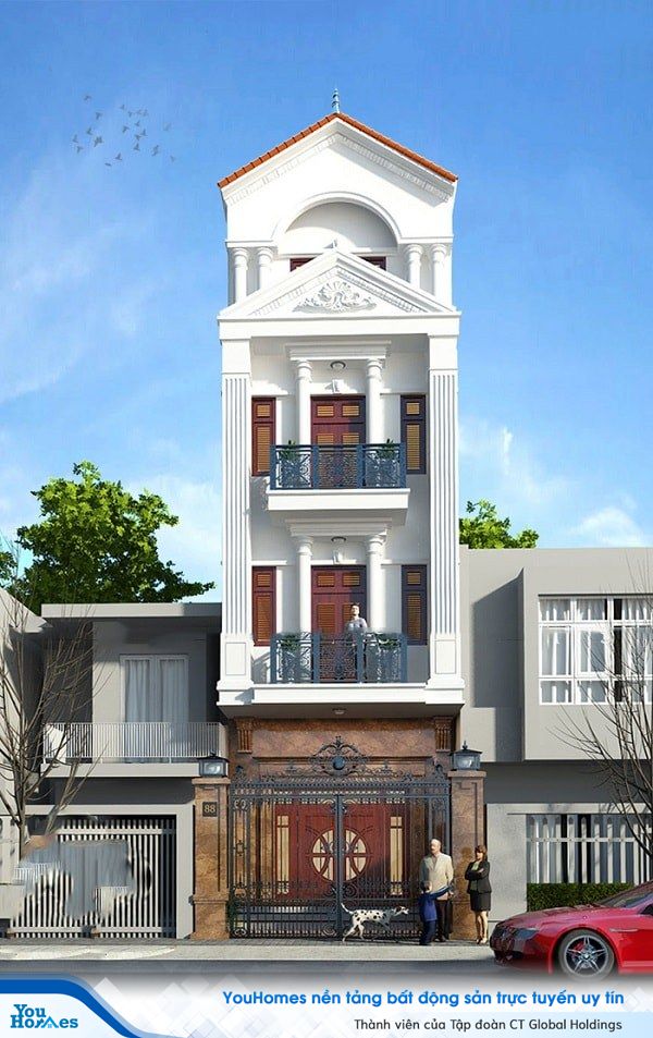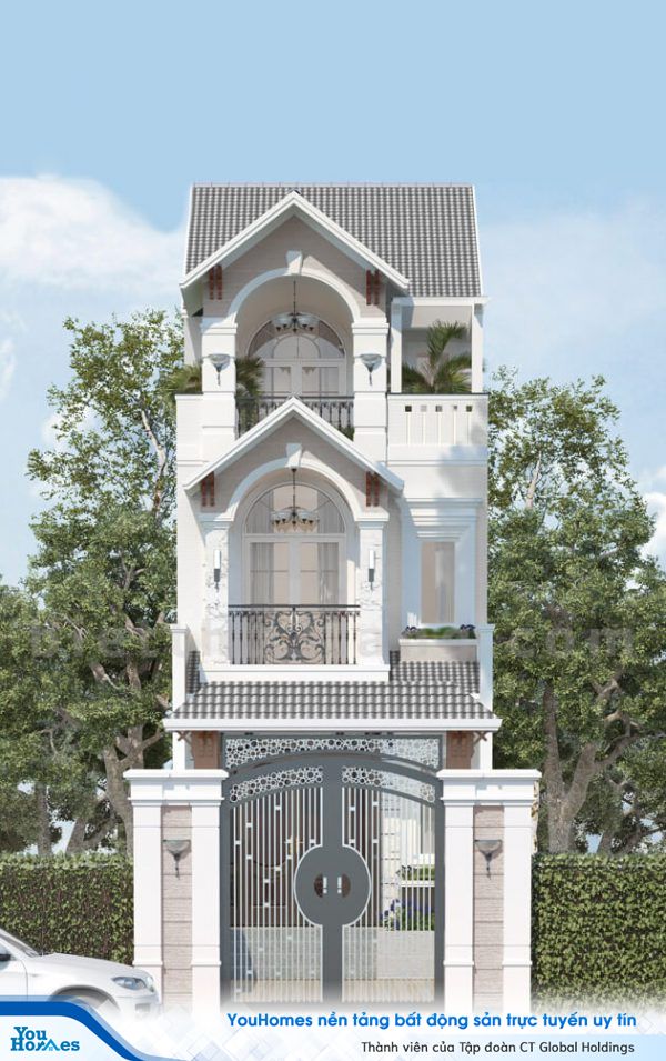 Mẫu nhà phố này được thiết kế theo phong cách Pháp với những họa tiết trang trí rất tỉ mỉ và công phu. Điểm nhấn chính của không gian chính là mái ngói ở cổng chính, cùng với lan can sắt rộng kéo dài gần hết mặt tiền, họa tiết trang trí, đường gờ nhỏ phối hợp với màu sơn trắng mang đến cái nhìn tổng quan có sức thuyết phục lớn cho không gian kiến trúc của ngôi nhà.