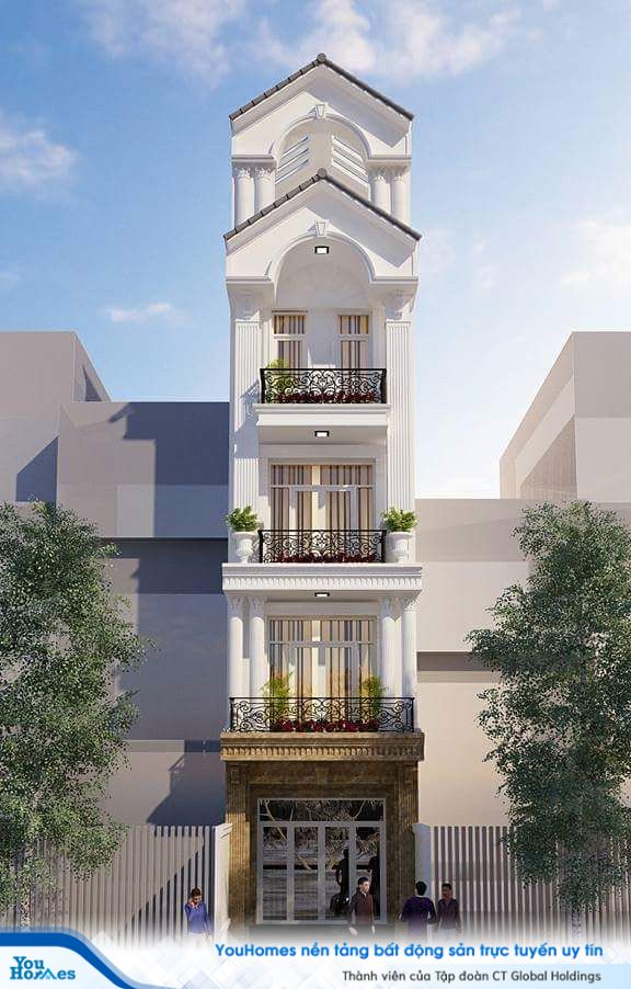 Một trong những mẫu kiến trúc nhà phố tân cổ điển đơn giản, thì không thể không thể kể tên đến mẫu thiết kế này. Không có sự xuất hiện của những thức cột Ionic hay những trụ cột vuông vức, thay vào đó là sự xuất hiện của chân cột âm tường. Hệ thống tường và cột chạy dọc song song kín ở hai bên, khối ban công và lan can được phô diễn đẹp mắt.
