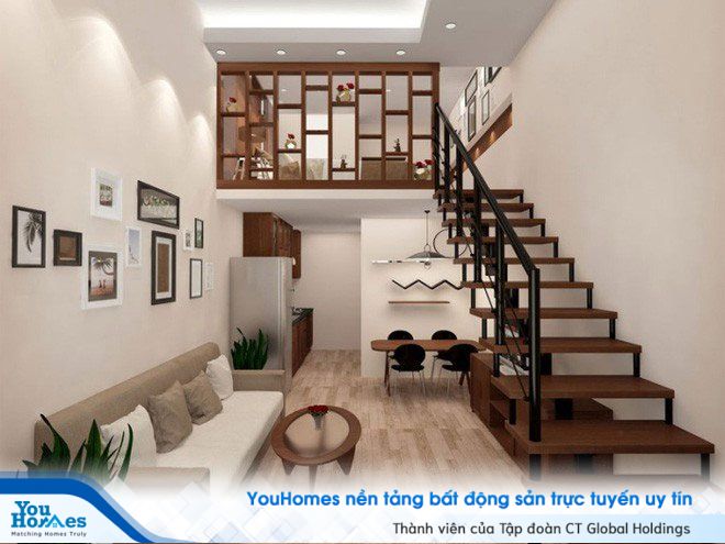 Không gian nhỏ nhưng nhờ thiết kế gác lửng hợp lý nên vẫn có đủ diện tích để gia chủ bày biện và thiết kế các khu vực yêu thích. Vách ngăn gỗ được sử dụng vừa có chức năng phân tách 2 khoảng không gian vừa là nơi để đựng đồ trang trí.