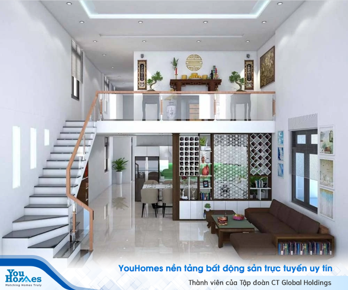 Theo quan niệm truyền thống, không gian thờ được bố trí kết hợp với phòng khách. Tuy nhiên nếu muốn ngôi nhà thêm rộng rãi và sử dụng được nhiều hơn phần diện tích thì bạn có thể sử dụng gác lửng làm không gian thờ.