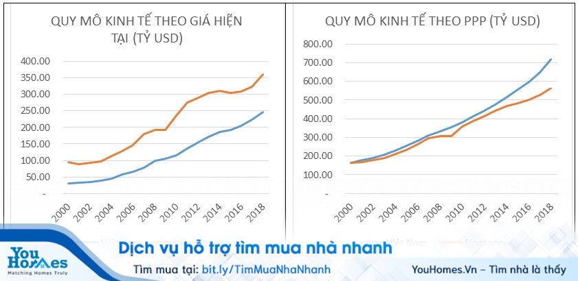 Trở lại với việc so sánh quy mô nền kinh tế Việt Nam và Singapore. Số liệu thống kê cho thấy, GDP Việt Nam năm 2018 đạt khoảng 247 tỉ USD, trong khi đó GDP Singapore đạt 361 tỉ USD. Xét theo thu nhập bình quân đầu người thì ở Việt Nam chỉ đạt 2.587 USD, còn Singapore là 64.041 USD. Xét theo sức mua tương đương tổng GDP của Việt Nam năm 2018 là 716 tỉ USD, còn Singapore là 565 tỉ USD. Trong khi đó, xét về thu nhập bình quân đầu người theo sức mua tương đương thì giữa Việt Nam và Singapore lần lượt là 7.500 USD và 100.344 USD. Như vậy, xét về quy mô nền kinh tế Việt Nam đã cao hơn Singapore tới 27%, nhưng xét về thu nhập bình quân đầu người theo sức mua tương đương thì người dân Singapore đang cao hơn Việt Nam khoảng 13,3 lần, còn theo giá hiện tại thì cao hơn 24 lần.