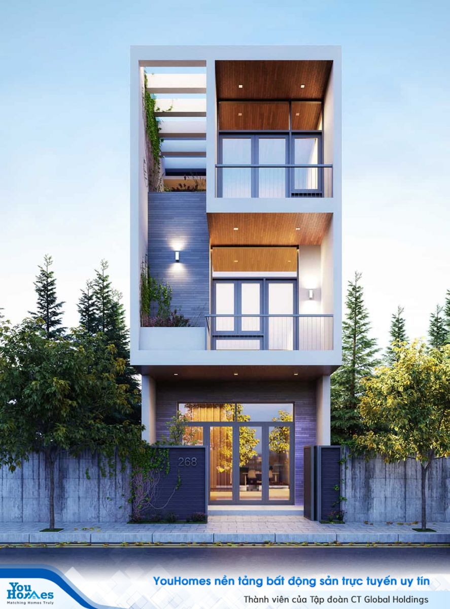 Sang trọng với mẫu nhà ống được thiết kế với những ô cửa gỗ thông gió tinh tế và tiện dụng. Mặt tiền căn nhà trở nên nổi bật với phần lan can tầng 3 và bậu của sổ tầng 2 được nối liền tạo nên sứ phá cách không thể nhầm lẫn. Ngôi nhà khá chú trọng không gian cho cây xanh bên ngoài giúp mang lại sức sống và sự mềm mại cho tổng thể.