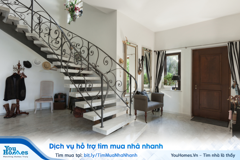 - Không bố trí cầu thang thẳng hàng với cửa ra vào. Cách bố trí này sẽ khiến năng lượng từ cửa chính xộc thẳng lên cầu thang, tạo sự bất ổn. Trong khi đó, khí trong phong thủy cần đi chậm để phân bố đều vào các không gian. Nếu không có lựa chọn tốt hơn, có thể khắc phục bằng cách dựng một vách ngăn nhẹ hoặc tủ kệ phía chân cầu thang. Đặt quả cầu thủy tinh hoặc cây xanh phía chân cầu thang cũng giúp làm giảm tốc độ của luồng khí.