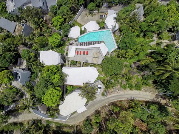 Nhìn từ trên cao, khu biệt thự bao gồm 3 khu nghỉ dưỡng, một sân thượng tắm nắng và một hồ bơi cao cấp nằm giữa trời.