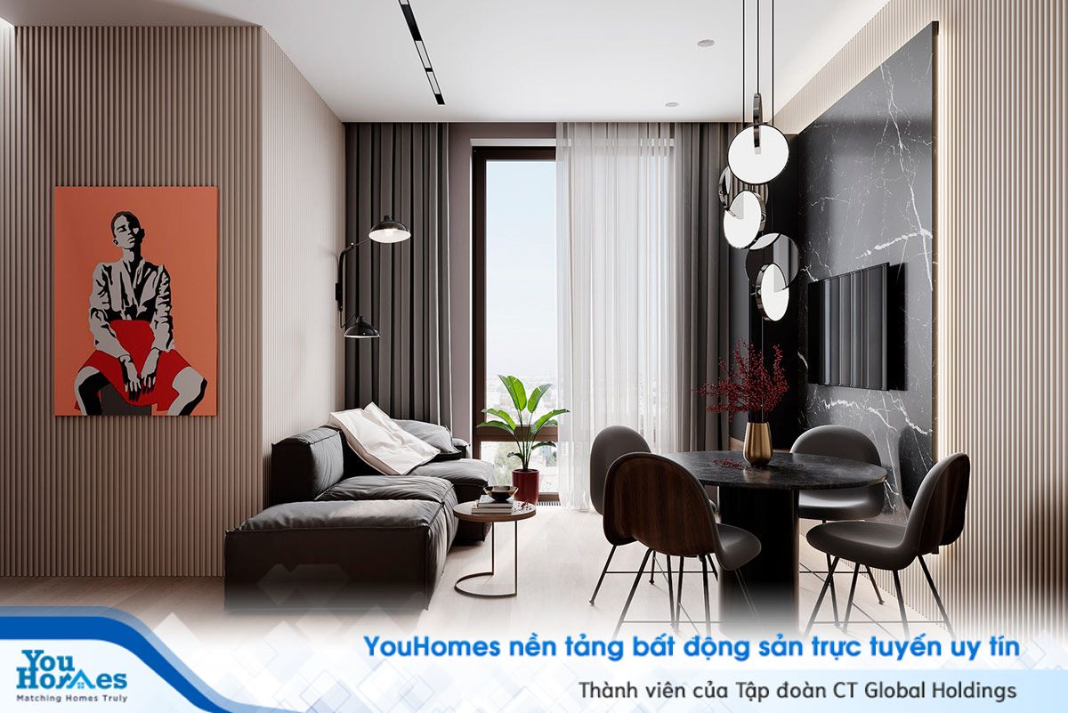 Căn hộ với thiết kế hiện đại với các gam màu sang trọng và tinh tế. Các đồ nội thất trang trí được bố trí hoàn hảo không có bất cứ chi tiết nào thừa thãi. Cửa sổ kính cỡ lớn giúp căn hộ có thể lấy được ánh sáng tự nhiên và luôn thông thoáng. Bức tranh với gam màu cam nổi bật giúp cho căn phòng không bị một màu và làm tôn lên cả tổng thể căn hộ.