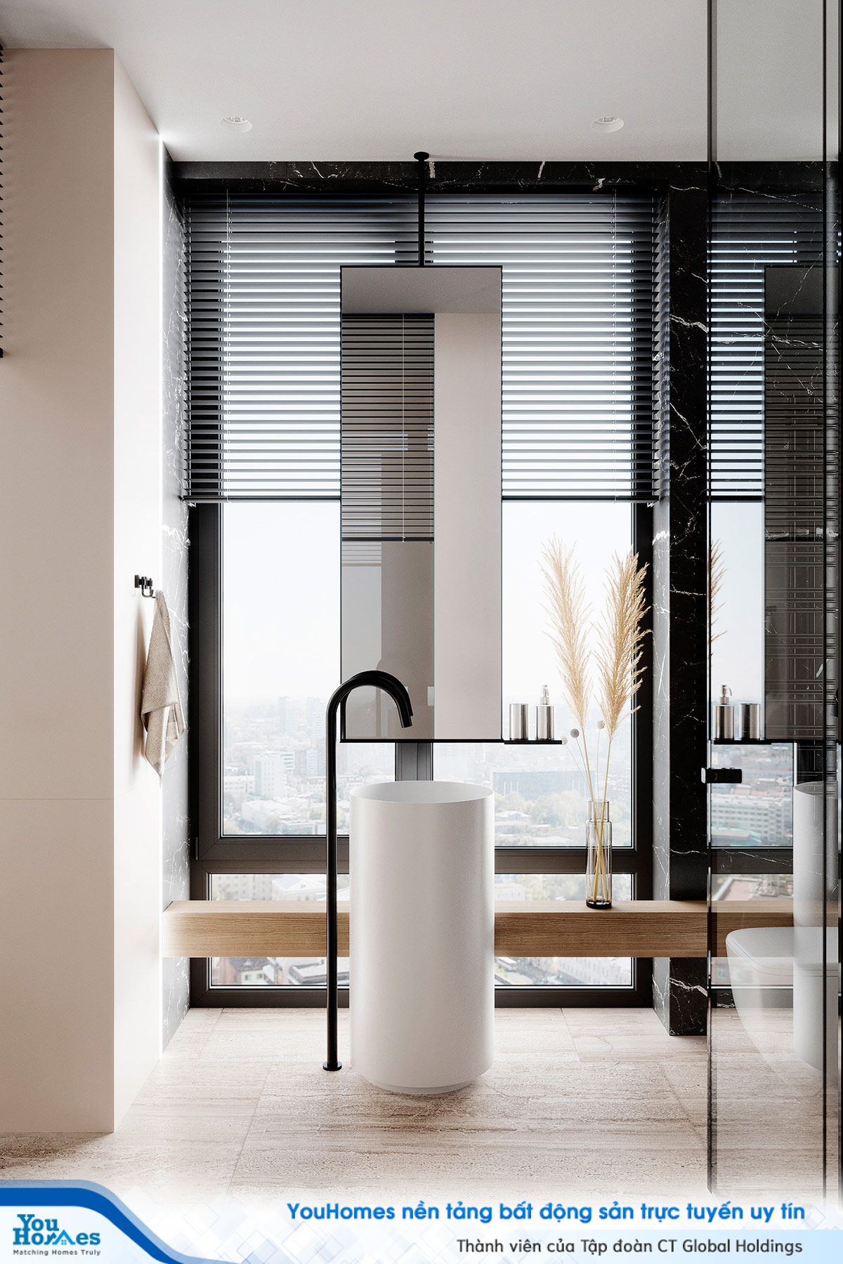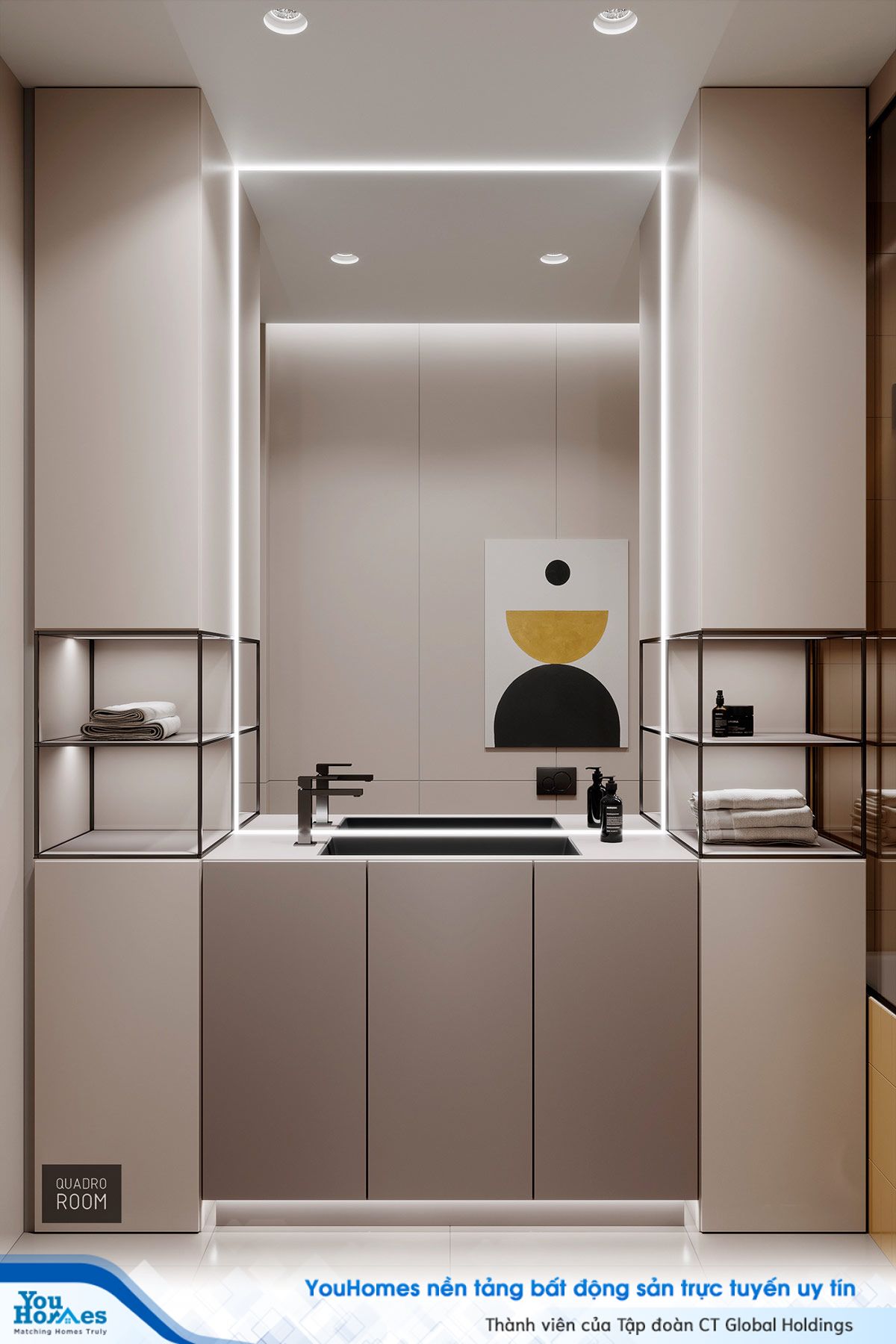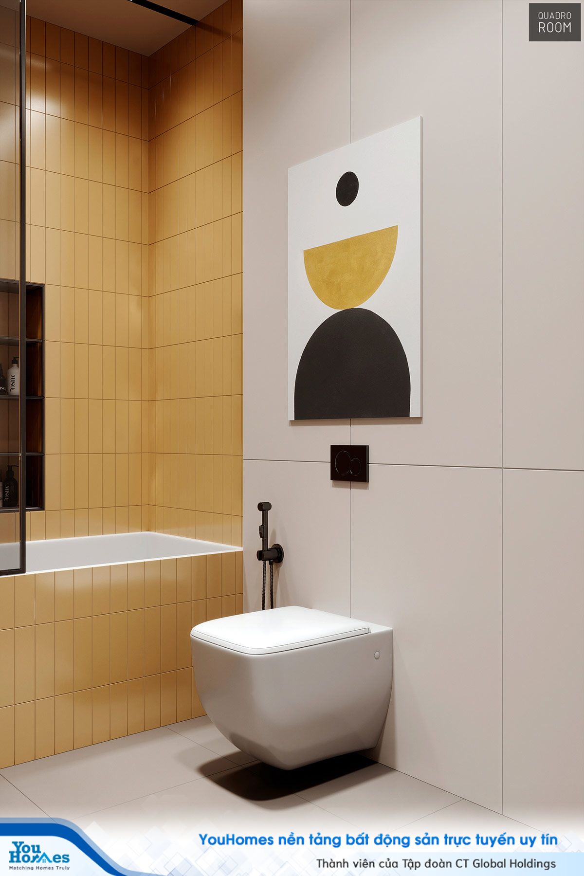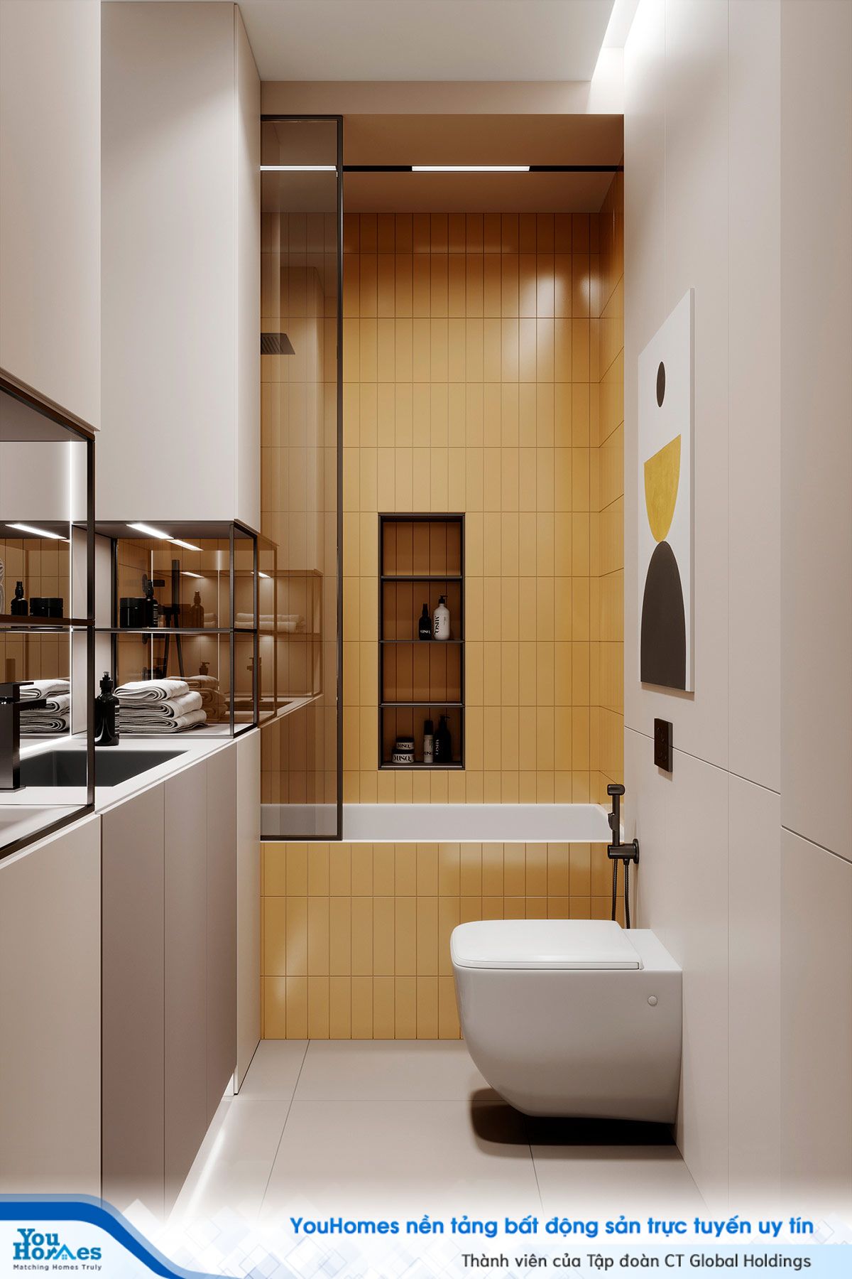 Khu vực bồn tắm và phòng vệ sinh với ngăn để xà phòng và sữa tắm nhỏ gọn bên trong không gian giúp việc lấy sữa tắm trở nên dễ dàng, các đồ vật hay sử dụng sẽ luôn đảm bảo ngăn nắp khi được xếp riêng biệt.