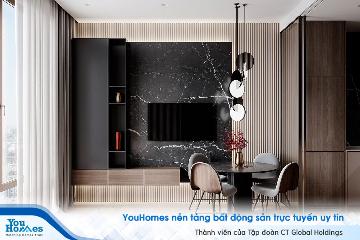 Tường phòng khách được thiết kế ốp đá đen cao cấp. Khu vực bàn ăn với bàn mặt đá đen tinh tế. Chiếc lọ hoa ánh vàng giúp bộ bàn ghế trở nên sang trọng hơn. Chủ nhà lựa chọn hoa màu khô màu đỏ cực kỳ phù hợp với không gian.