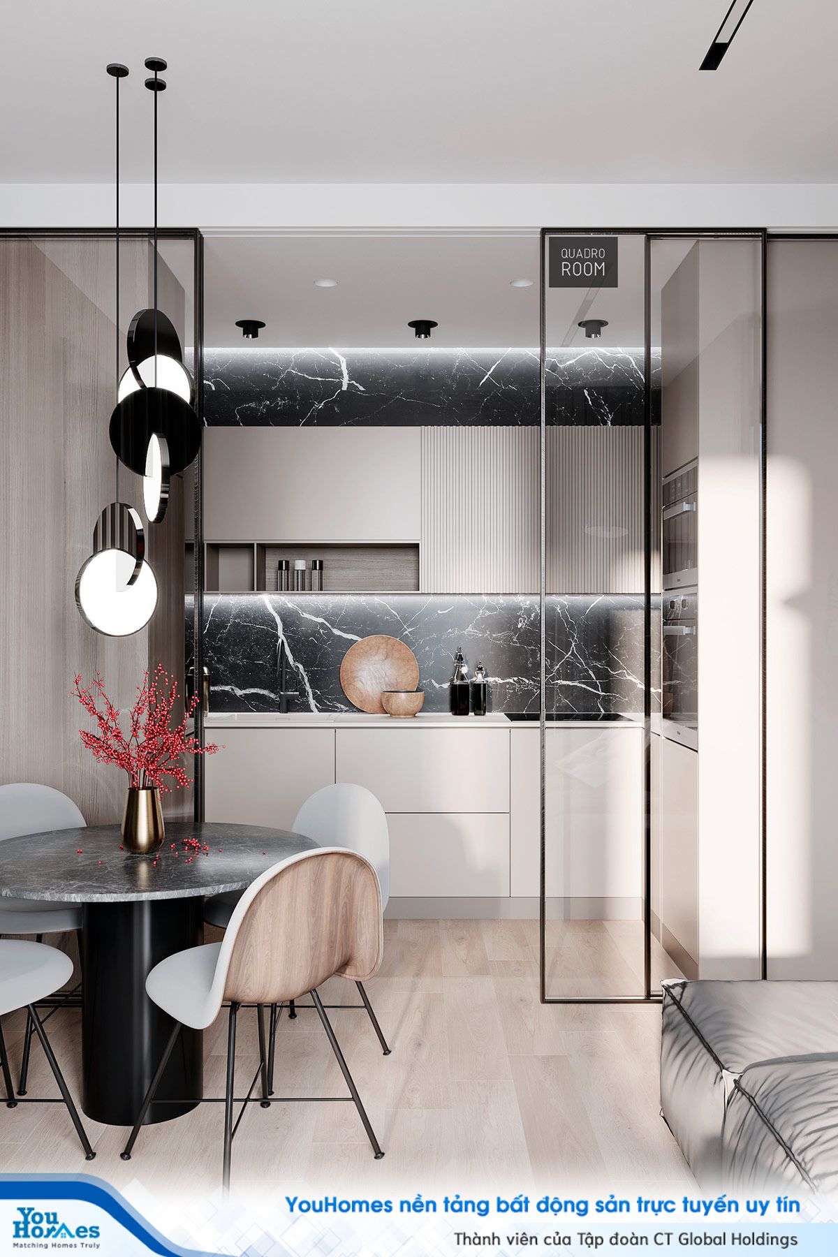 Phòng ăn cực kỳ sang trọng đươc ngăn cách giữa phòng khách và khu vực bàn ăn bằng cửa kính trượt, khu tủ bếp gọn gàng với các ngăn tủ rộng rãi, giúp căn bếp luôn gọn gàng sạch sẽ.