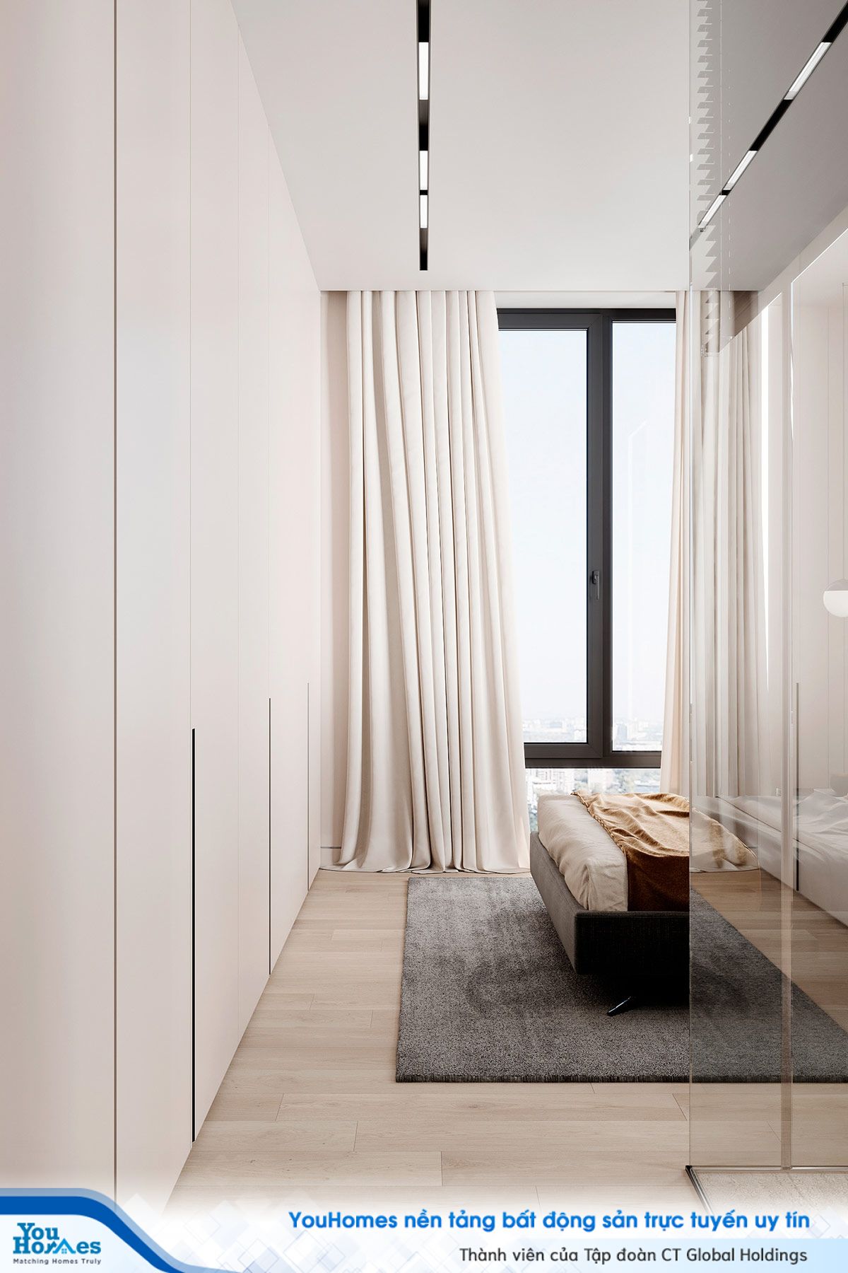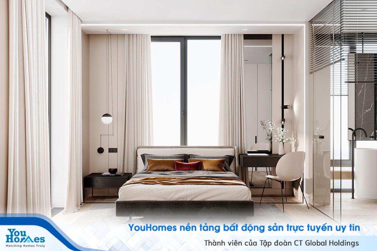 Phòng ngủ rộng rãi với thiết kế bàn trang điểm gọn gàng và nhỏ nhắn. Gương bàn trang điểm được gắn trực tiếp vào tường giúp không gian trở nên thoáng đãng hơn. Thiết kế đen flaj mắt lại được sử dụng trong không gian phòng ngủ, giúp căn phòng trở nên bắt mắt hơn. Gối và ga trải giường bằng nhung với màu sắc nổi bật giúp tổng thể căn phòng được tôn lên bội phần. Phần nhà tắm ngăn cách với phòng ngủ hoàn toàn bằng kính. Có thể che đậy lại bằng mành xoay cực kỳ đặc biệt.