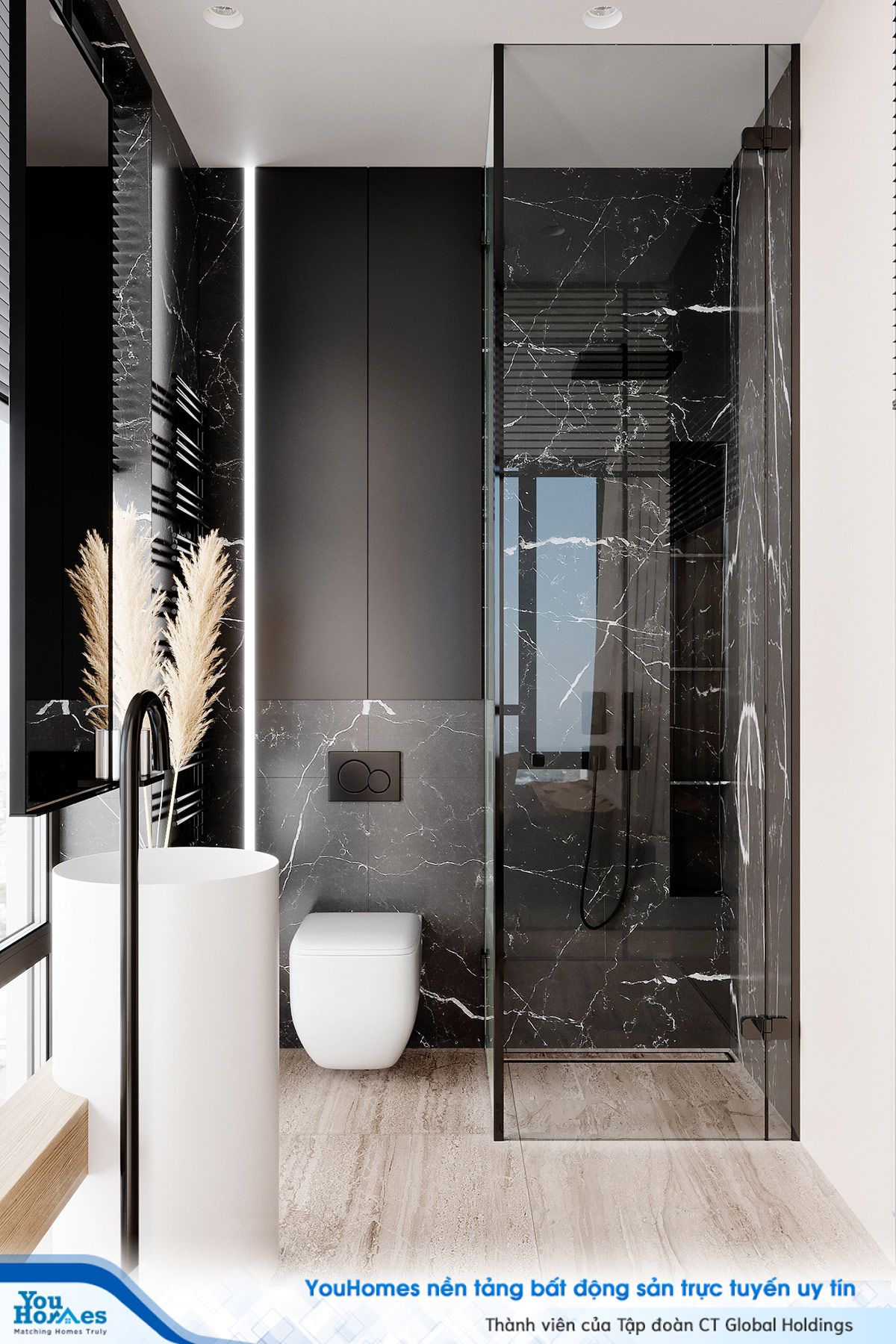 Bồn tắm đứng nhỏ gọn cùng khu vệ sinh được ốp đá với gam màu đen sang trọng tạo nên tổng thể tuyệt vời cho phòng tắm.