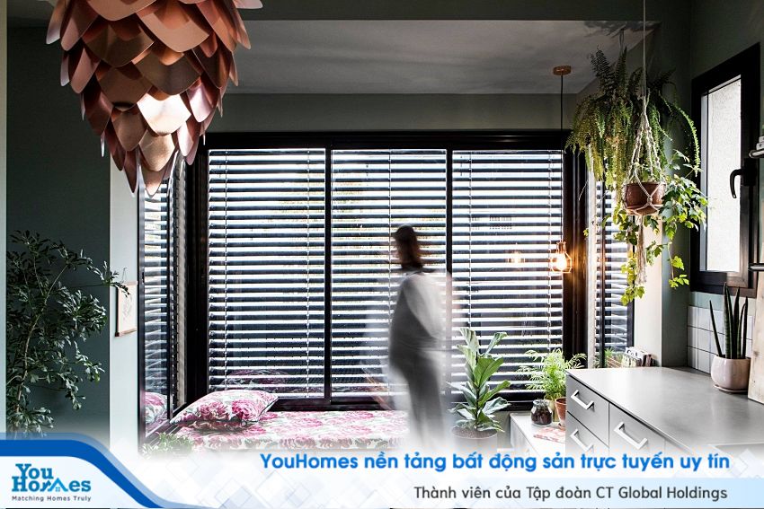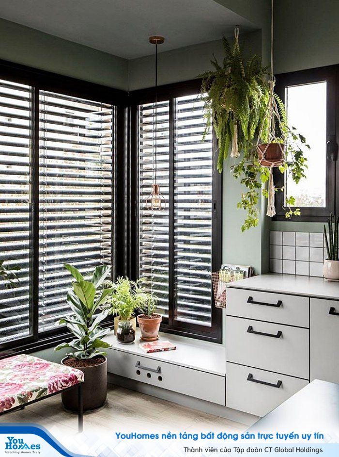 Chiếc giường nghỉ nhỏ nhắn bên bậu cửa sổ là một nơi tuyệt vời để chủ nhân thư giãn và ăn sáng mỗi ngày. Những chiếc chậu cây nhỏ nhắn xung quanh tạo nên một không gian thư giãn và thoáng đãng.