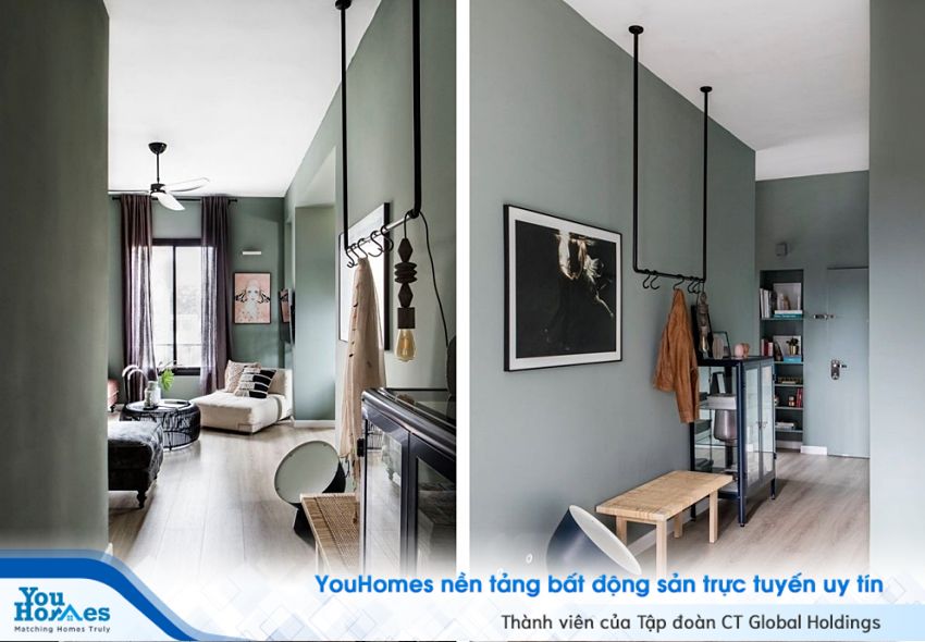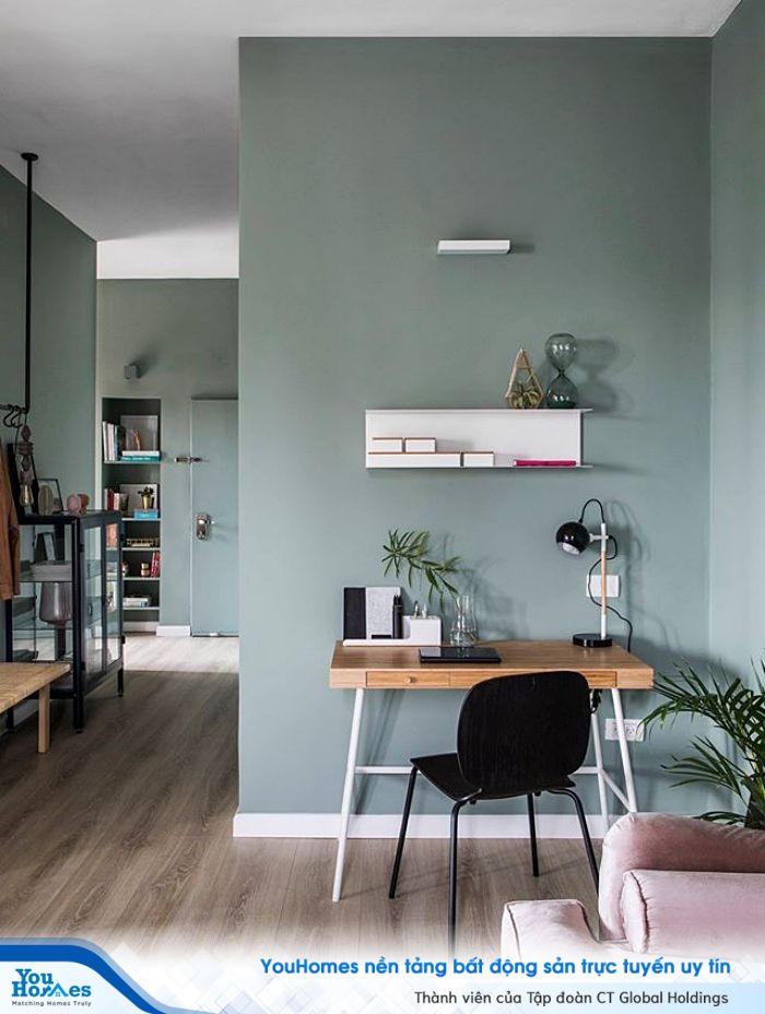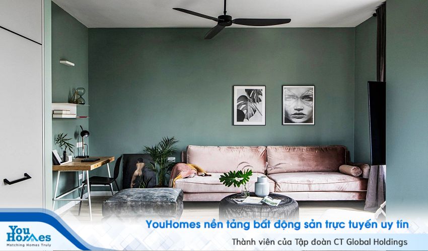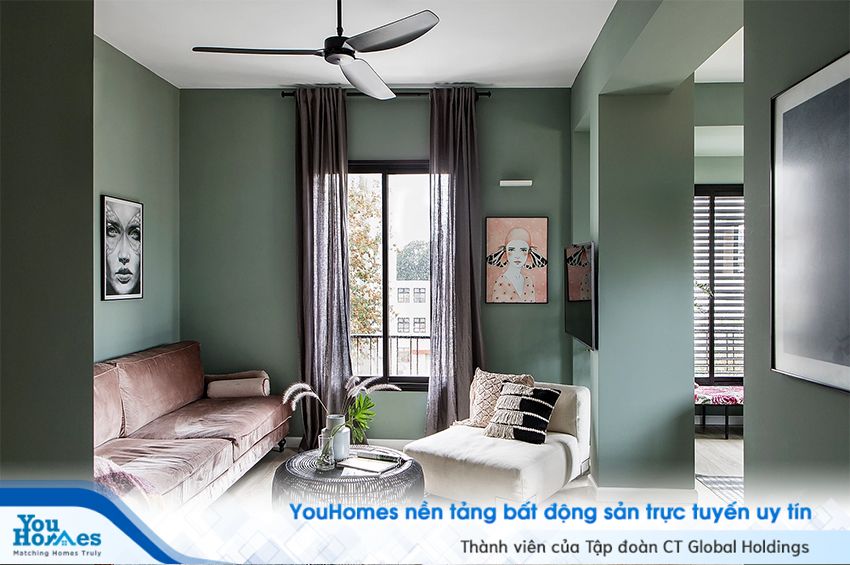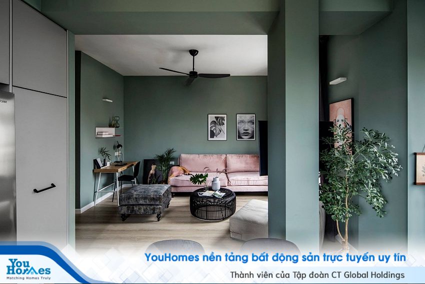 Ngôi nhà với màu xanh lá tông trầm chủ đạo tạo nên sự tinh tế và phần nảo thể hiện được cá tính của chủ nhân căn nhà. Bộ sofa với kích thước nhỏ nhắn và chất liệu vải nhung đặc biệt tạo sự đặc biệt cho không gian phòng khách. Các tác phẩm nghệ thuật được bày trong phòng cũng theo một phong cách khá đặc biệt tạo nên điểm nhấn riêng. Chiếc bàn uống nước với thiết kế tối giản làm tôn lên sự nổi bật của màu sắc chiếc sofa giúp tổng thể hòa hợp.