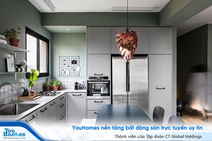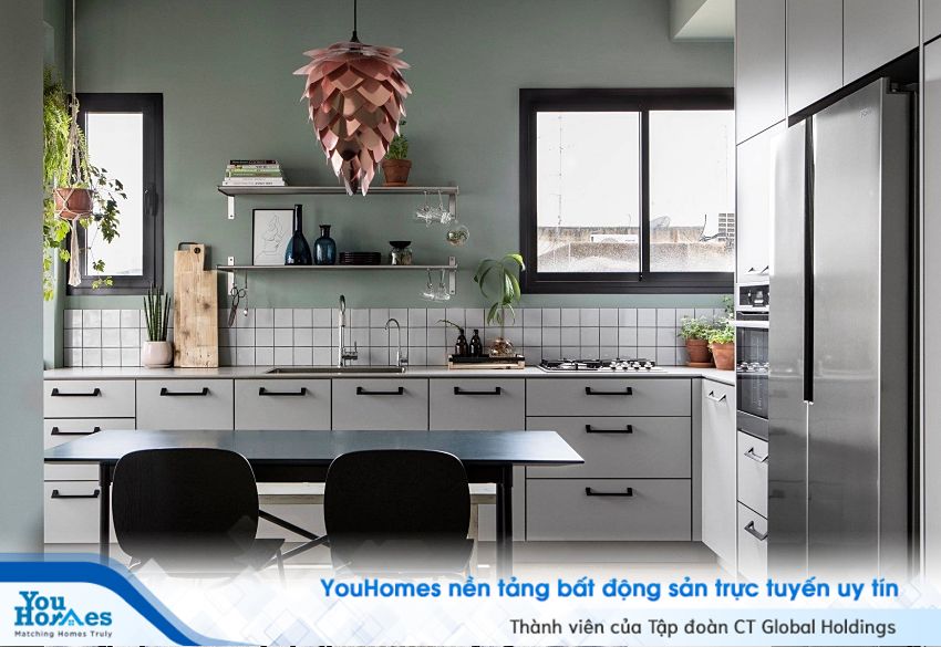 Căn bếp hiện đại và tươi sáng với tông tủ bếp ghi sáng sở hữu thiết kế tay càm nổi bật. Chiếc đèn bếp với thiết kế cách điệu độc đáo cùng chất liệu ánh kim nổi bật. Những chiếc chậu cây nhỏ nhắn làm tăng thêm sức sống cho căn bếp.