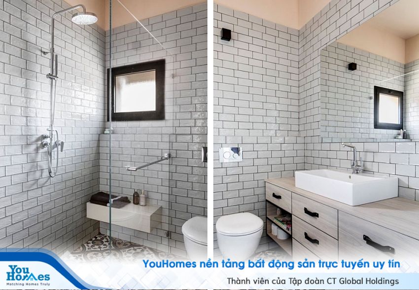 Phòng tắm thiết kế hiện đại với sàn đá hoa độc đáo. Bồn tắm đứng với vách ngăn tiện dụng giúp khu vực nhà tắm luôn khô ráo. Bồn vệ sinh với thiết kế âm tường giúp không gian nhà tắm trở nên tinh tế.