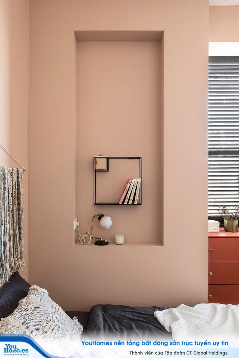 Phòng ngủ với gam màu hổng nổi bật cùng phần tường âm để treo đồ trang trí và giá sách nhỏ. Các chi tiết trang trí của giường ngủ cũng cực kỳ nữ tính với phần tua rua treo trang trí ở đầu giường theo phong cách du mục.
