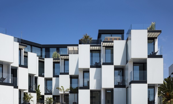 Tổng thể Sir Joan Ibiza là một tòa nhà 4 tầng với mặt tiền được thiết kế kiểu hình hộp sole xếp chồng. Đây chính là bí quyết ăn điểm giúp tòa nhà nổi bật và hút khách một cách độc đáo và có tính duy nhất. Trông chúng như một mô hình toán học không gian cực kỳ ấn tượng.