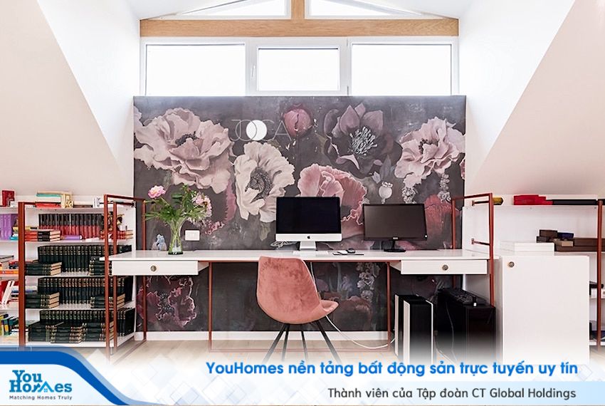 Hoa văn trên tường làm nổi bật khu vực văn phòng và thêm không khí nghệ thuật lên trần nhà. Các giàn gỗ kiểu dáng duy trì một bầu không khí tươi mới cho không gian hiện đại.