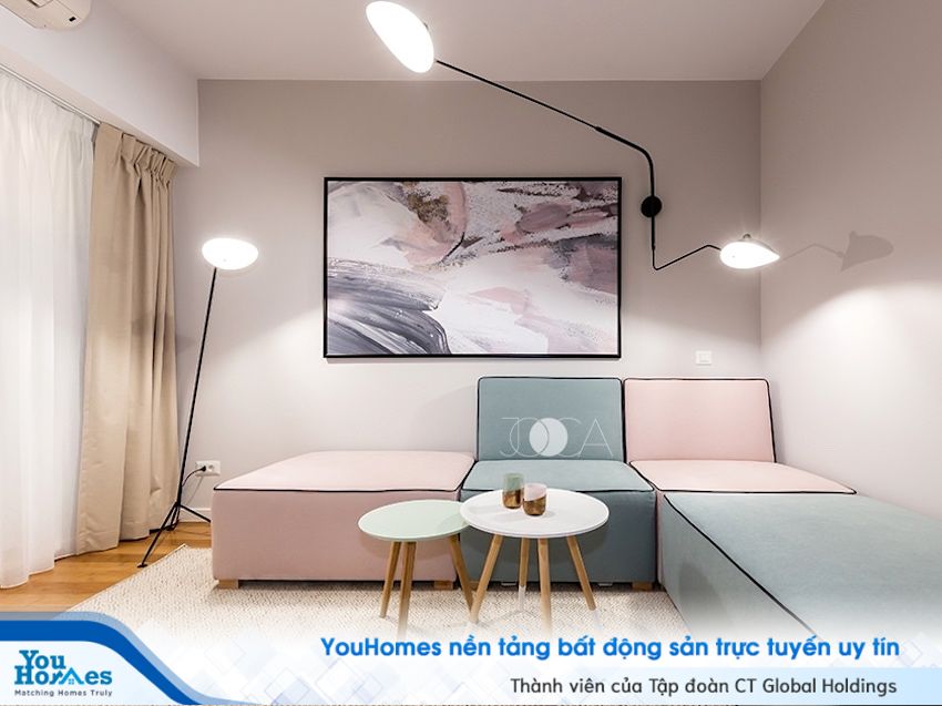 Thêm một chiếc ghế đơn màu xanh lá cây, bàn cà phê chân bàn bằng vàng hồng và một chiếc ghế đẩu màu trắng, đầy màu sắc nữ tính.
