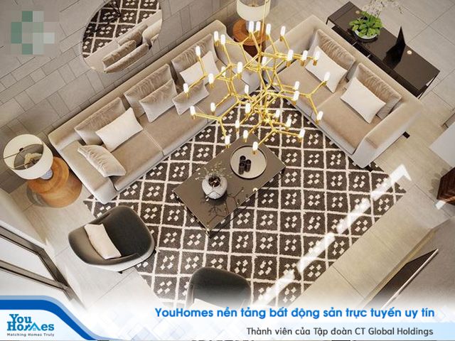 Ngôi nhà có thiết kế trần cao sang trọng với chiếc đèn chùm có hình dáng khá độc đáo. Phòng khách được sử dụng đồ nội thất với thiết kế sang trọng tông màu chủ đạo là ghi xám, điểm nhấn của căn phòng là mẫu đèn chùm ánh kim. Gương tròn đặt đằng sau sô pha giúp căn phòng trở nên rộng rãi hơn.