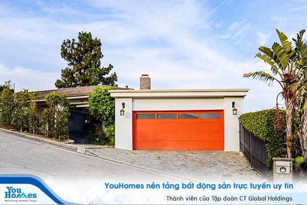 Nhà để xe riêng biệt hai mặt phố được sơn một màu cam tươi sáng cho sự hấp dẫn lề đường nổi bật.