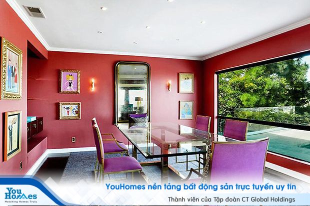 Phòng ăn được tạo điểm nhấn bằng những chiếc ghế bọc nệm màu tím sang trọng.