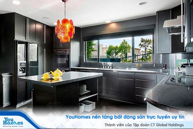 Nhà bếp hiện đại, sang trọng và đầy đủ tiện nghi ấn tượng nằm bởi đèn chùm thủy tinh nhiều lớp và bộ trà màu vàng.