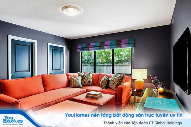 Phòng chiếu phim với màu sắc rực rỡ, RuPaul nhân đôi sự quyến rũ và vui vẻ trong phòng chiếu này với một tấm thảm in hình con hươu cao cổ, gối ném da báo và một chiếc ghế dài hình chữ L màu cam.