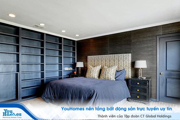 Thiết kế nội thất táo bạo trong phòng ngủ với một bức tường của kệ mở và một tấm thảm nặng để làm nổi bật căn phòng.