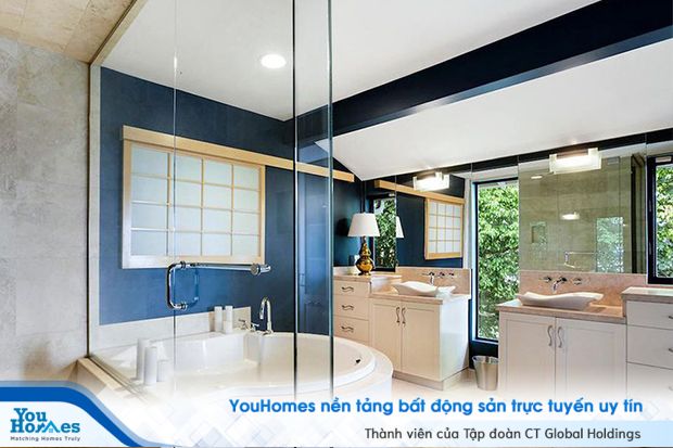 Phòng tắm sang trọng với bồn ngâm sâu và bồn rửa độc đáo.