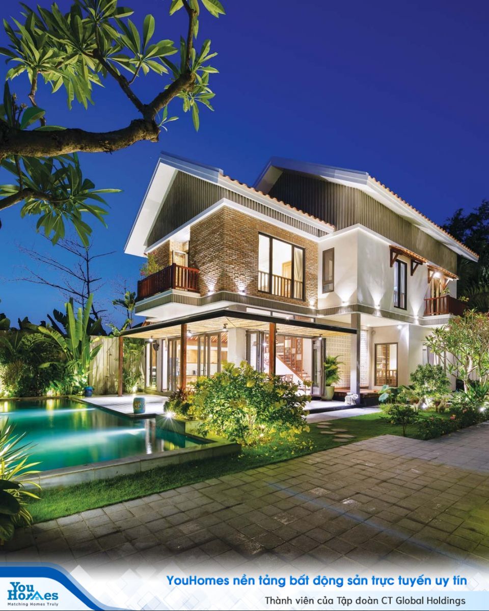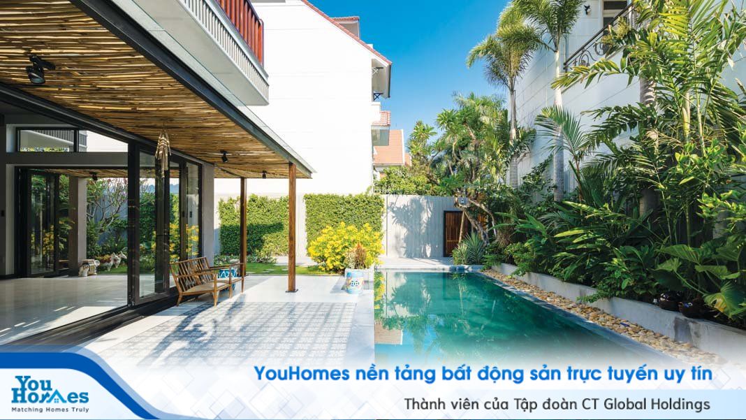 Sân vườn và bể bơi tuyệt đẹp của ngôi biệt thự, trông giống như khung cảnh của một khu resort mini.