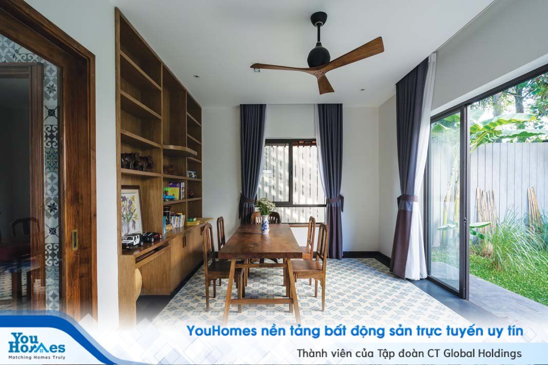 Phòng ăn rộng với thiết kế bàn cổ điển. Phần gạch hoa được ốp dưới sàn tạo nên điểm nhấn cho căn phòng. Quạt trần bằng gỗ cực kỳ độc đáo. Thiết kế tận dụng tối đa các khung cửa kính giúp tận dụng ánh sáng bên ngoài một cách tuyệt đối.