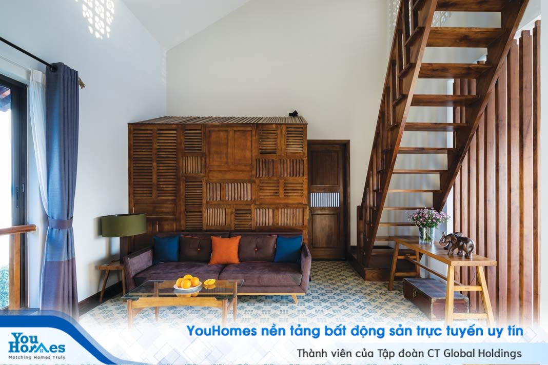 Phòng khách xinh xắn của ngôi biệt thự với đồ nội thất được lựa họn hoàn toàn bằng gỗ. Những chiếc gối màu sắc thú vị giúp xóa tan cảm giác nhàm chán và một màu, giúp căn phòng trở nên có chiều sâu hơn.