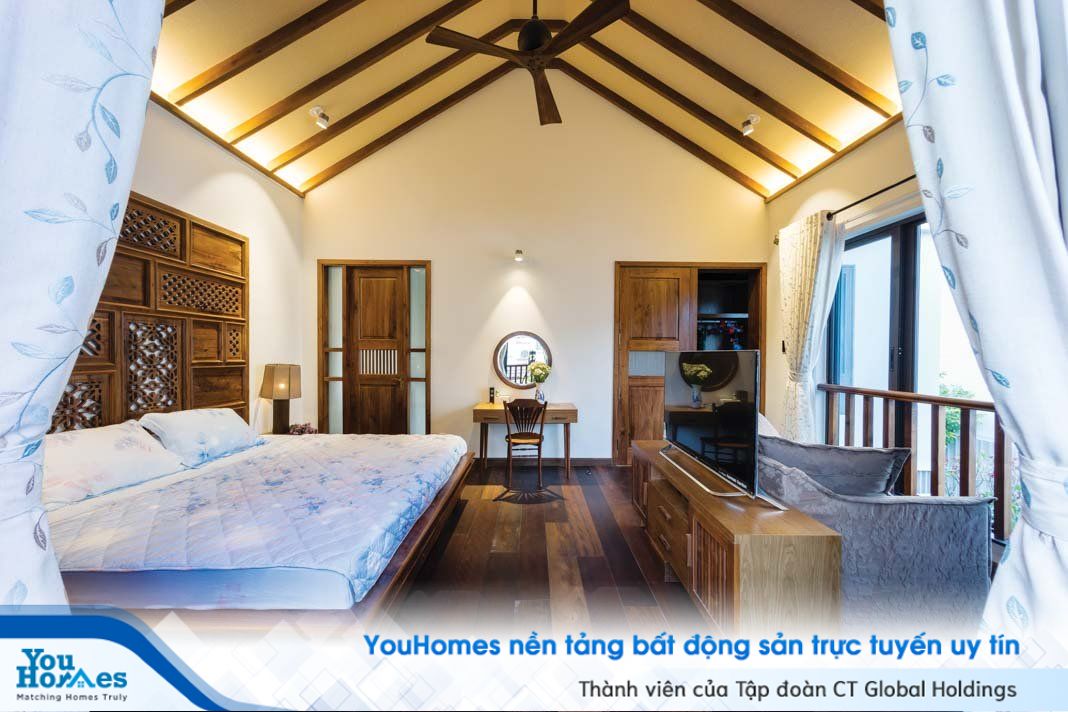 Phòng ngủ với chiếc giường "king size" giúp người sử dụng luôn có cảm giác thoái mái và không bị gò bó khi sử dụng. Chiếc sofa lớn được đặt cạnh phần cửa sổ nhìn ra sân vườn tươi mát giúp tạo nên không gian tuyệt vời để ngả lưng và thư giãn.