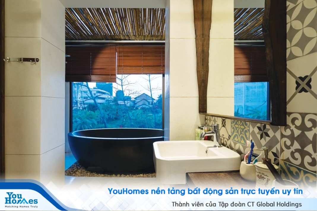 Bồn tắm với thiết kế lạ mắt bên dưới dải sỏi cực kỳ ohuf hợp với màu sắc của chiếc bồn. Các đồ nội thất đều được tận dụng từ gỗ và mây, tre đan đem lại cảm giác gần gũi và ấm áp.