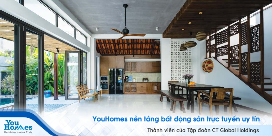 Không gian siêu rộng của phòng khách và phòng bếp của căn biệt thự, với phàn cửa ra vào kích thước lớn, giúp không khí trong ngôi nhà luôn được lưu thông và thoáng mát.