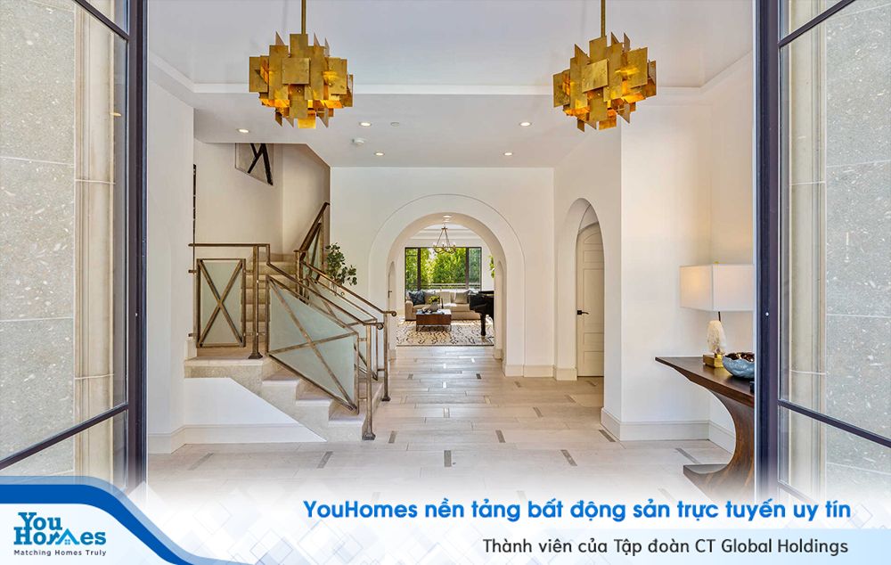 Bước vào căn nhà, sảnh sang trọng rộng rãi thanh lịch với sàn lát hình học, có lan can cầu thang lấy cảm hứng từ nghệ thuật trang trí cổ điển và đèn chùm bằng đồng quyến rũ