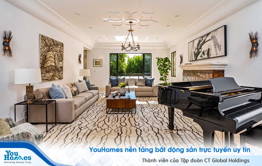 Tiếp đến là phòng khách chính rộng rãi có tấm thảm nổi bật, lò sưởi và một chiếc piano lớn.