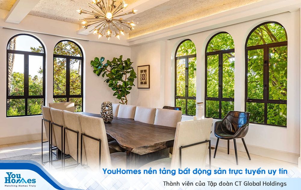 Bàn ăn được đặt cạnh cửa sổ có kính lớn có tầm nhìn đẹp mắt và xanh mát ra cảnh quan xung quanh.