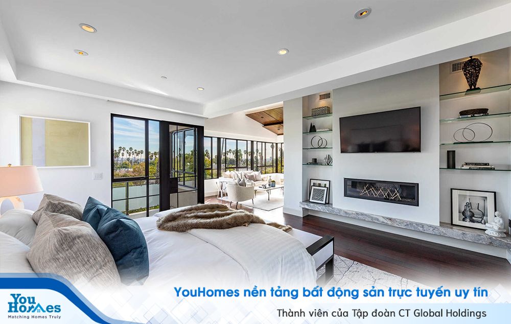 Phòng ngủ chính với lò sưởi, ban công bao quanh riêng và nội thất sang trọng.