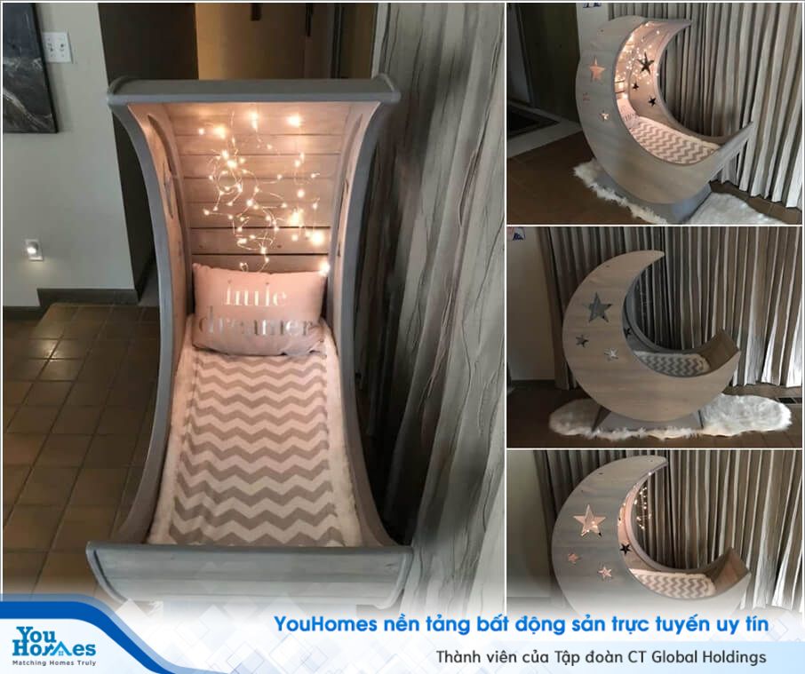 Bạn đang phân vân chọn lựa những chiếc nôi xinh xắn cho bé yêu thì đừng bỏ qua ý tưởng này nhé. Bằng sự khéo léo và sáng tạo của bạn, bạn có thể hô biến những thanh gỗ thành chiếc nôi hình mặt trắng xinh xắn và đáng yêu. Trang trí thêm chút đèn nhỏ xinh như những ngôi sao lấp lánh để kích thích thị giác của bé. Một tấm thảm êm ái trải bên trong nôi để bé nằm thật thoải mái.