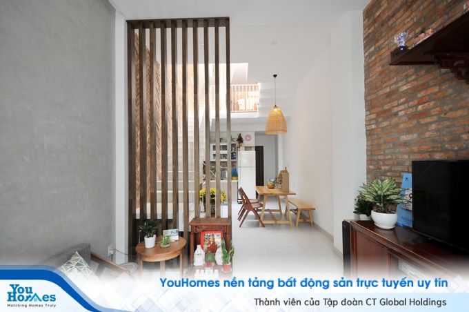 Phòng khách nhỏ nhắn, tận dụng lại tối đa đồ nội thất cũ để tiết kiện chi phí. Không gian phá cách với bức tường gạch thô kết hợp với tường trắng tạo nên những mảng màu thú vị cho ngôi nhà. Phòng ăn và phòng khách được ngăn cách bằng những tấm ván gỗ giúp không gian trở nên tinh tế hơn và che đi phần cầu thang lên xuống.