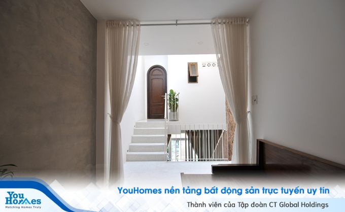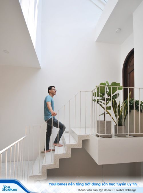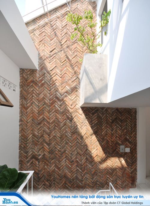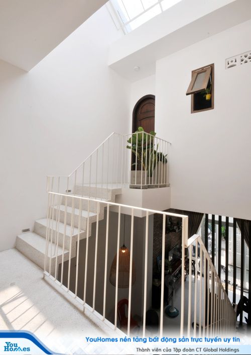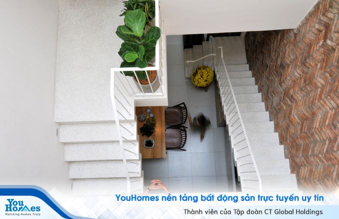Thiết kế hành lang cầu thang với những viên gạch thô đan chéo độc đáo. Cầu thang với tông màu chủ đạo là trắng giúp căn nhà trở nên sáng sủa hơn.