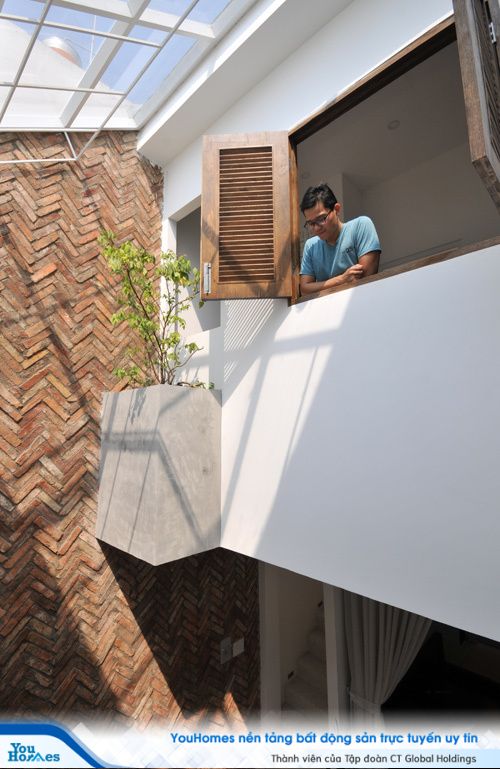 Cửa sổ tầng 2 nhìn xuống phần sân vườn tầng 1. Chậu cây nhỏ nhắn được đặt tại vị trí cửa sổ tạo nên sự thú vị cho thiết kế.