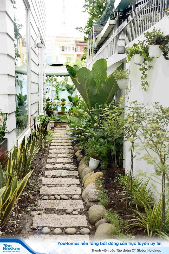 Lối đi dọc căn nhà cũng trải đầy cây cỏ kết hợp với lối đi rải đá đẹp mắt tạo nên một không gian đẹp và trong lành